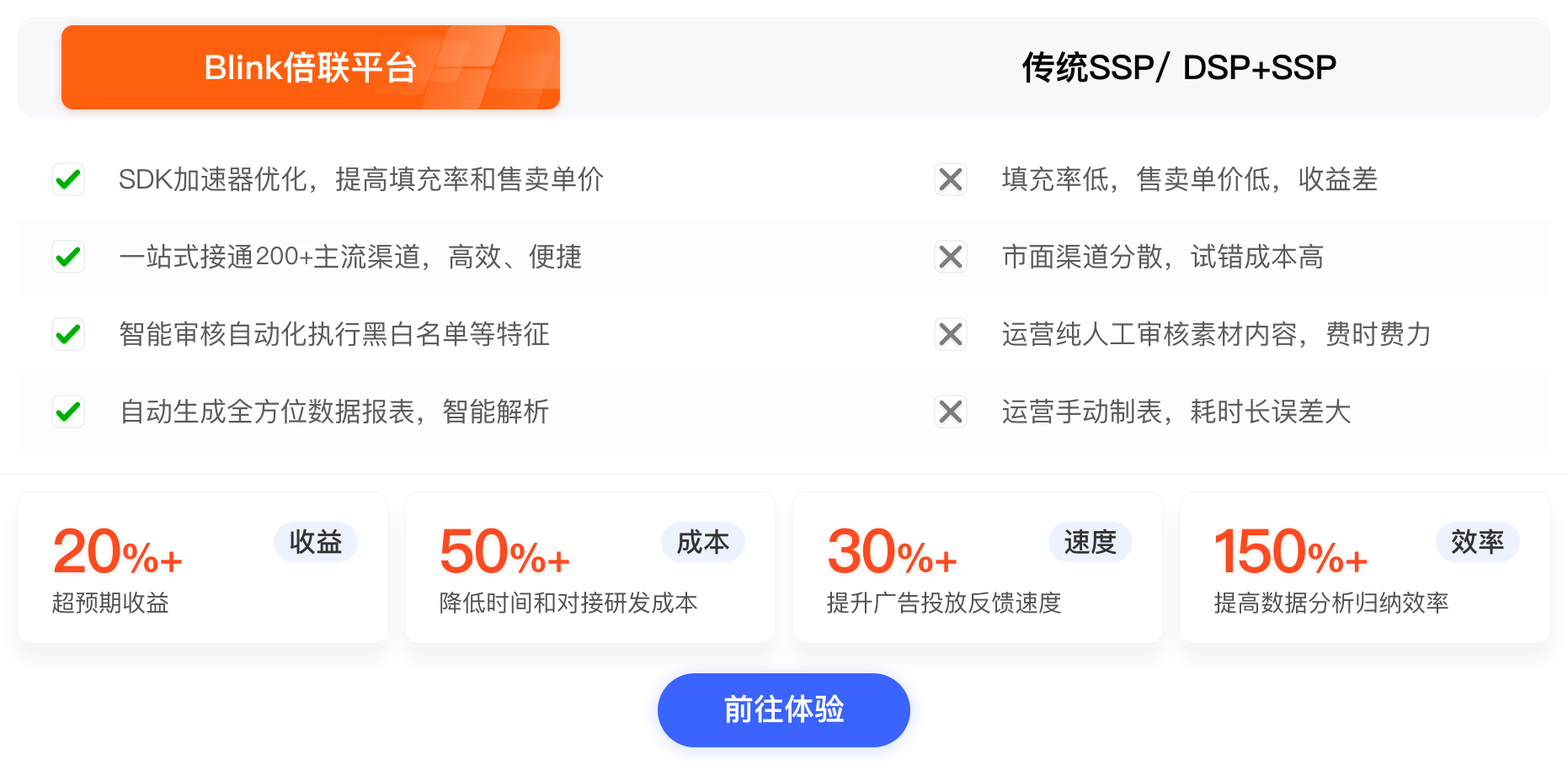 移动开发者追求的是APP广告收益最大化,可如何实现APP收益最优化且稳定呢?那就要在技术架构上对现有“广告请求-广告竞拍”的核心逻辑进行改造激发沉默流失收益。APP广告变现业务痛点目前的业务流程,当APP内某个广告位想请求并展示广告的时候,技术架构会按照Waterfall模式从上到下的广告源顺序来请求和展示广告,完成流量分配分发。某APP开屏广告位每日有400万个请求,经过测试估算出T广告源,50%填充率,40元/cpm;C广告源,80%填充率,30元/cpm,移动开发者怎样进行广告请求才能让收益最大化呢?A:将400万个请求都给T,广告收益=4000000 x 50% x 40/1000=80000B:将400万个请求都给C,广告收益=4000000 x 80% x 30/1000=96000方案B的总体收益最高。 虽然C广告源虽然价格低,但是填充率高抬高了整体收益。有没有一种方法能实现在已知价格和填充率高低,整合方案A和B,实现对T广告源高价和C广告源高填充充分开发的优化方案呢?在现有Waterfall模式下( 方案W):将400万个请求先给T广告源,未填充的给C广告源,理论收益最优= 4000000 x 50% x 40/1000 + 4000000 x(1-50%)x 80% x 30/1000 = 128000很明显方案W优于AB,广告请求拍卖在Waterfall模式下,一定程度下保证了高cpm和高填充率。可在实际业务中,这400万的广告请求是广告位单日多次请求的总和,T广告源和C广告源因时间段、用户画像等因素针对每次请求给予的采买价格和填充量都不是固定的。无论40元30元还是50%80%都是一种基于前日的预估,可能在多次广告请求中,C广告源的采买价格都高于T广告源(只是填充量相对于整日填充量较少,所以拉低了C广告源价格的预估),每次都给T广告源优先填充,这样也造成了很多的沉默广告价值流失。那又有什么方法可以实现每次请求广告收益最优,从而实现请求总和的广告收益优化从量变到质变的转化吗?倍业Bidding,国内SDK/API全域融合实时Bidding开创者。倍业Bidding针对APP广告位每一次请求进行全域融合实时竞拍,并遵循“价高者得”的竞拍规则。通过局部每一次“广告请求-广告竞拍”最优化,达成移动开发者追求整体广告收益最优化的目标。相较于传统单一的Waterfall模式,倍业Bidding重新定义APP广告变现技术架构,已经帮助合作的上述APP实现了收益提升30%,APP广告整体填充率提升至95%。倍业Bidding已将SDK客户端竞价(Client Bidding)和API服务端竞价(Server Bidding)融合进行Bidding,目前已完成对穿山甲gromore、腾讯广告优量汇、阿里tanx、快手、拼多多、京东等进行技术集成。此外,我们发现部分APP主要预算来源的广告平台并不支持外部Bidding,我们也为此推出了倍业Bidding + Waterfall的混合竞价优化方案,同时支持自定义添加更多广告平台配置,满足该类移动开发者尝鲜增收的意愿。倍业Bidding + Waterfall:倍业Bidding + Waterfall优化缩减了单一Waterfall模式下的多个ID和分层。具体表现为多个实时竞价渠道在倍业Bidding后,胜出者进入Waterfall的预留Bidding ID位,减少了未胜出的竞价渠道ID设置和Waterfall的层级。倍业Bidding胜出者再按照Waterfall顺序,从上到下逐层与不支持Bidding的优质广告源预设价格“竞价”,最终胜出者获得该次广告填充展示。倍业Bidding两种技术对接特点在集成倍业Bidding SDK时,发布商可通过C2S(Client-to-Server)或S2S(Server-to-Server)方式进行集成。移动开发者需根据两种对接方式的特点,结合自己的实际情况选择合适的方案进行对接。C2S步骤C2S的询价发起方为客户端的SDK,移动开发者调用SDK接口进行询价,通常在应用的客户端本地进行竞价。这种方式集成简单、直接,但由于竞价逻辑在客户端,调整灵活性相对较低,且客户端受网络环境影响较大,一旦网速差就会延迟高,竞价信息传输速度可能会受到一定的影响。S2S步骤S2S的询价发起方为移动开发者或广告聚合平台的服务器(通常为OpenRTB请求),并且竞价逻辑在移动开发者或广告聚合平台的服务器上完成。这种方式的服务端通信延迟低、耗时短,同时竞价逻辑调整更灵活,但集成成本相对较高,需要发布商自建服务器。倍业Bidding除了收益优化这一核心亮点,在响应时长(出价和广告加载)也上有显著提升。此外,倍业Bidding与Blink的流量管理、AI监管(智能素材审核+智能预警)、诊断分析、资产管理、到投放管理等管理工具相嵌合,而且还对正式合作伙伴开放数据采集等代码,从源头保证合作伙伴数据等安全。倍业科技整合多家数据,为开发者提供多维度全方位数据报表,开发者可在Blink平台及时全方位洞察分析判断效果。更多惊喜请报名参与倍业Bidding测试!倍业科技成立于2015年,以“赋能媒体商业化”为使命和愿景。自主研发推出APP自己的商业化管理和运营产品Blink,先后获得了险峰华兴、竑观投资、颐成投资等机构的投资。业务涵盖视频、社交、金融、教育、交通出行、汽车、母婴、动漫、工具等多个领域媒体商业化。已与国内100多款知名媒体建立长期合作伙伴关系。倍业科技整合了API和SDK解决方案,结合了全栈式广告技术,通过流量管理和运营优化工具,为媒体充分挖掘每个流量的价值。